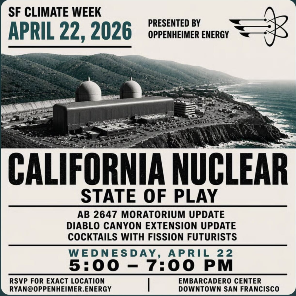 On Wednesday, April 22, Co-Executive Director Charles Oppenheimer and Oppenheimer Energy Head of Development & Partnerships Ryan Pickering hosted an event on the future of the nuclear energy industry in California amid efforts to overturn the State’s 50-year-old moratorium on new nuclear builds.